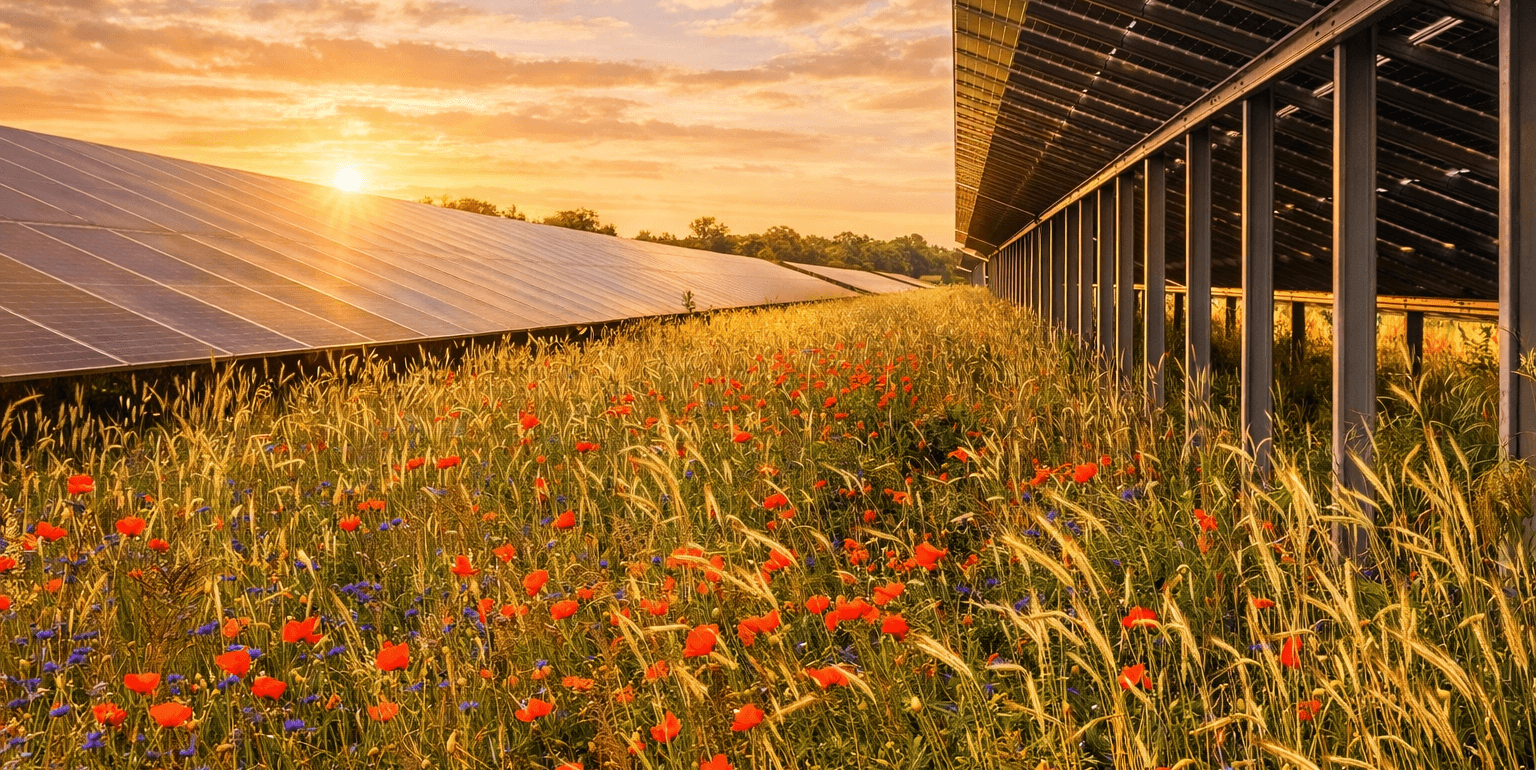 Ultimately, in autumn 2024, a solar park covering 5.7 ha with a capacity of 5.8 MW was commissioned, along with a multi-row bird hedge and an ecologically valuable wildflower meadow established on and next to the solar park site, which are maintained by sheep.